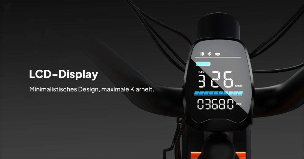 Es gibt vier Fahrmodi: Tretunterstützungsmodus: Stellen Sie die Unterstützungsstufe (0–5) über das Display ein. Daumengasmodus: Beschleunigen Sie Ihr E-Bike frei mit dem Daumengas. Normalmodus: Stellen Sie die Unterstützungsstufe auf 0 und treten Sie wie bei einem normalen Fahrrad. Schiebemodus: Halten Sie die Minustaste drei Sekunden lang gedrückt, um in den Schiebemodus zu wechseln. Das E-Bike fährt dann ohne manuelle Krafteinwirkung mit 4,83–6,44 km/h (3–4 mph) und lässt sich so auch auf unebenem Gelände (z. B. schmalen Wegen und steilen Hängen) leicht bewegen.